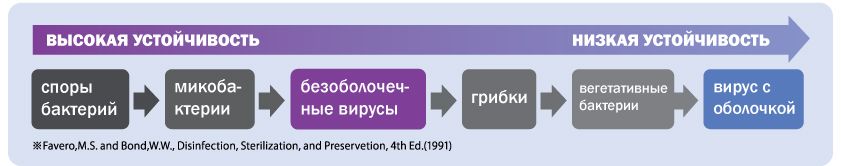 Устойчивость каждой группы микроорганизмов к дезинфицирующим средствам